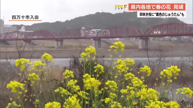 四万十川・赤鉄橋そばで『菜の花』が見頃 あすから『菜の花まつり』も開催