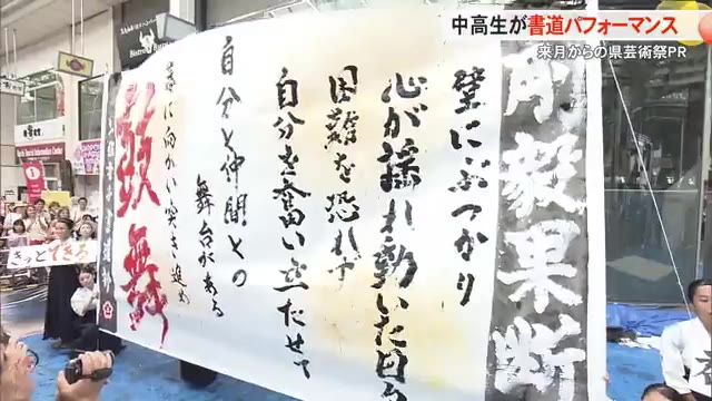 高知市の帯屋町商店街で土佐女子中高の書道部18人が披露した「書道パフォーマンス」。9月14日から始まる「高知県芸術祭」のプレイベントで「芸術」「鼓舞」をテーマに縦3メートル、横5メートルの2つの作品が書き上げられました。